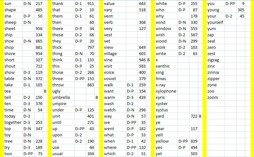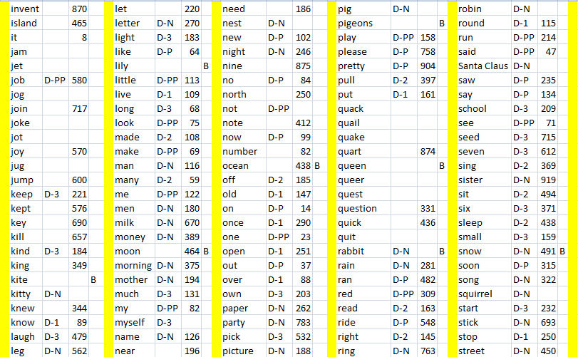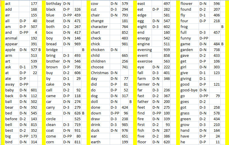 In selecting words for ABC Words, I started by attempting to illustrate as many Dolch words as possible (about 85% of all Dolch words). The list was entered into a spreadsheet, with Dolch nouns (D-N), Pre-Primary (D-PP), Primary (D-P), First Grade (D-1), Second Grade (D-2) and Third Grade (D-3) listed. Then, in order to provide at least ten words for each letter, words from the 1000 most common words in the English language were used. Because we used the Gaskin woodcuts to illustrate the cover page of each SMART Table Activity Pack, the key word which Georgie Gaskin used (B) were included in my word list.